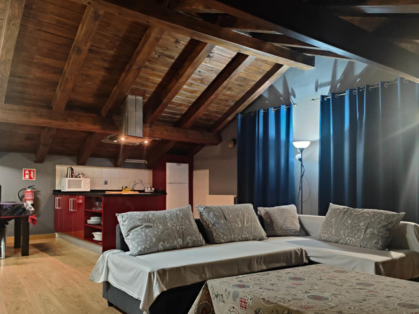 Salón-cocina con zona wifi, TV plasma y sofá cama.