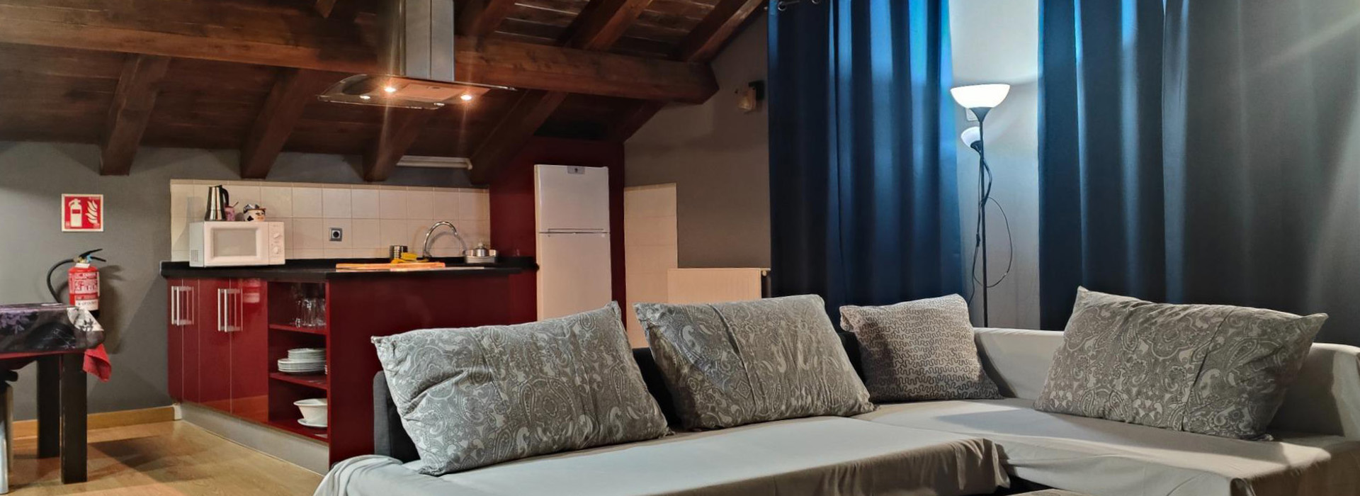 Salón-cocina con zona wifi, TV plasma y sofá cama.